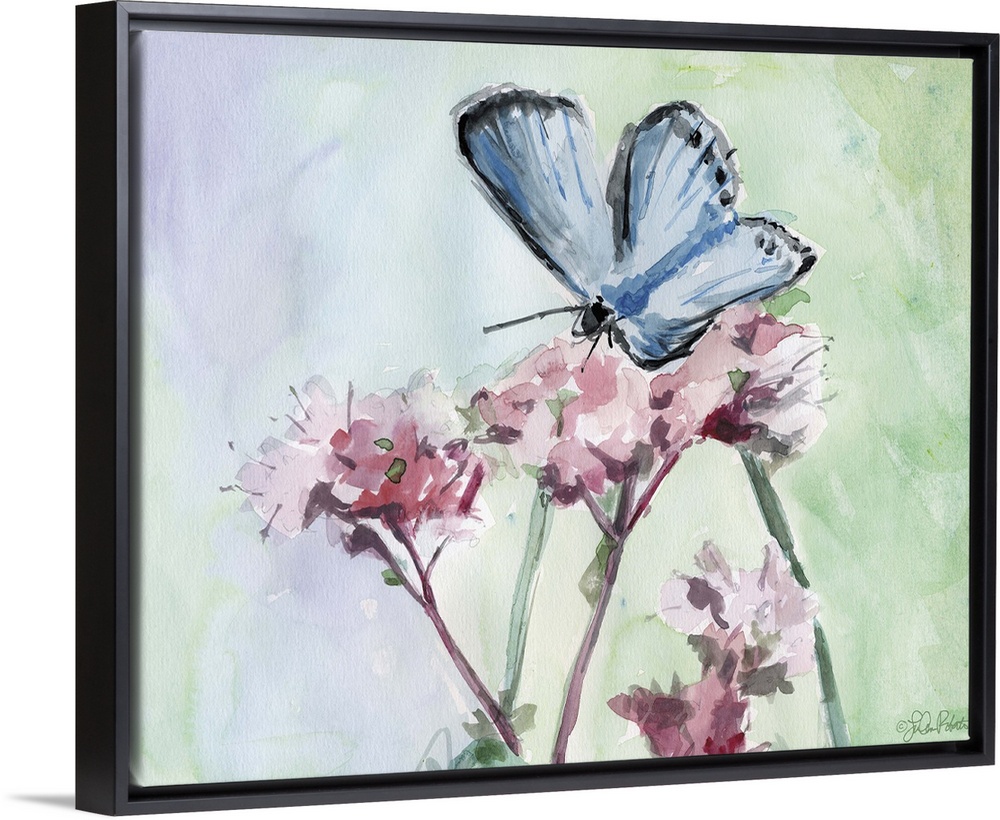 <p>Watercolor painting of a blue butterfly on top of pink flowers with a background made up of green, yellow, blue and purple hues.</p>