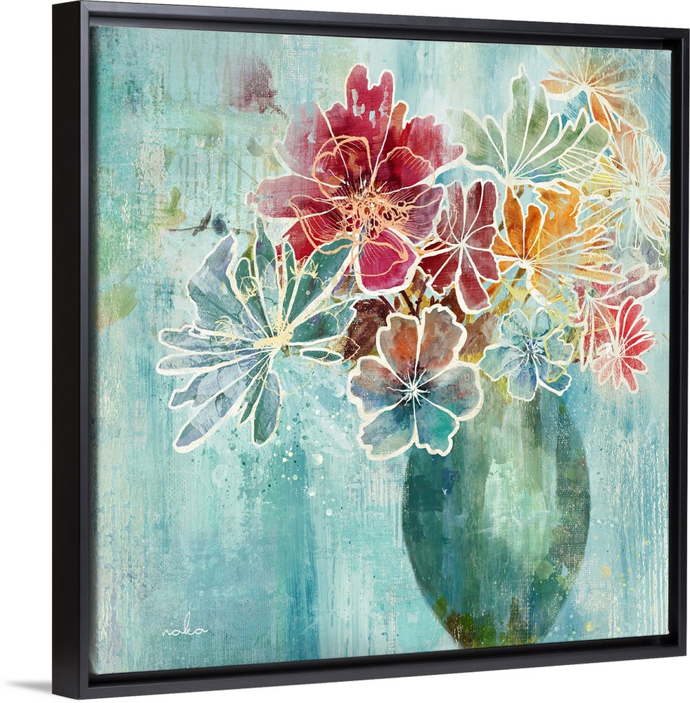 <p>Artistic square painting of a vase full of colorful flowers outlined in white on a blue background with drips and speckles of paint.</p>
