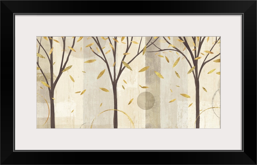 <p>Contemporary artwork of three trees with metallic gold leaves falling on a neutral patterned colored background with a few circles.</p>