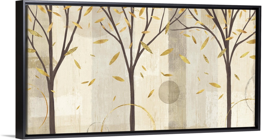 <p>Contemporary artwork of three trees with metallic gold leaves falling on a neutral patterned colored background with a few circles.</p>