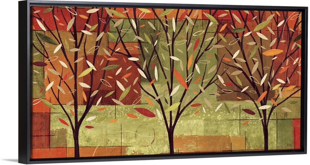 <p>Landscape, big home art docor of three side by side, contemporary trees with scattered, falling, autumn colored leaves. On a background of squares and rectangles in the same colors as the leaves.</p>