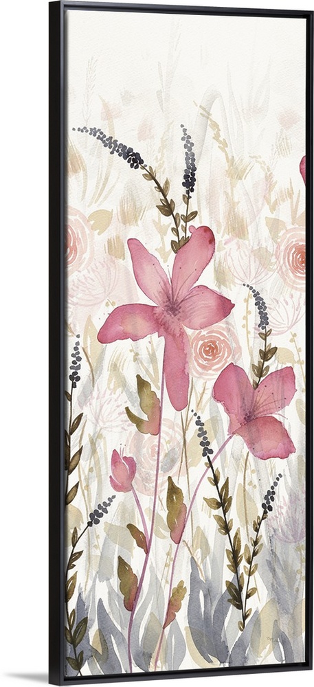<p>Long vertical watercolor painting of pink flowers in a garden with faded flower details in the background.</p>
