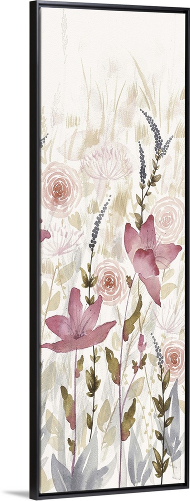 <p>Long vertical watercolor painting of pink flowers in a garden with faded flower details in the background.</p>