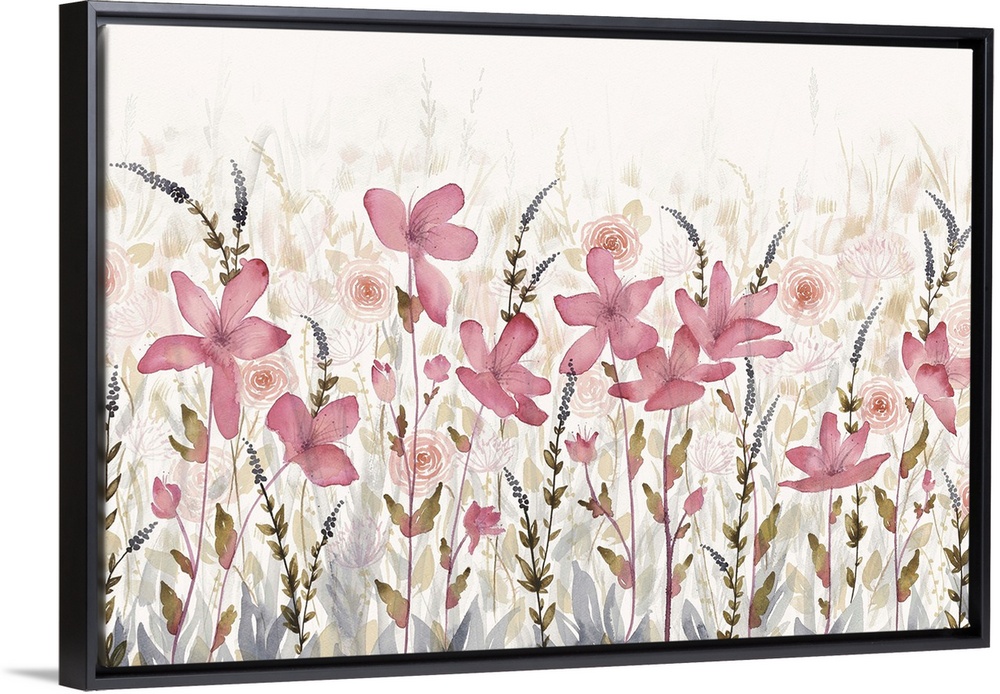 <p>Large horizontal watercolor of a field of pink flowers which faded into the background.</p>