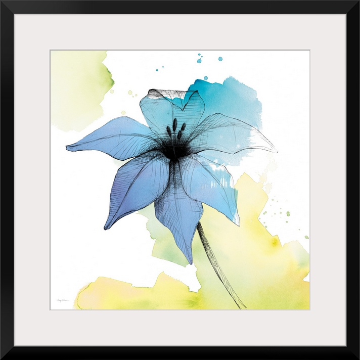 <p>A square watercolor painting of a blue lily with black sketched lines.</p>