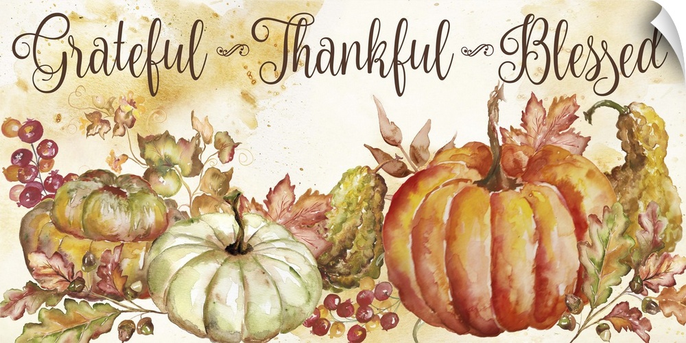 <p>Grateful, Thankful, Blessed on a watercolor painting of a group of pumpkins and gourds with autumn leaves.</p>
