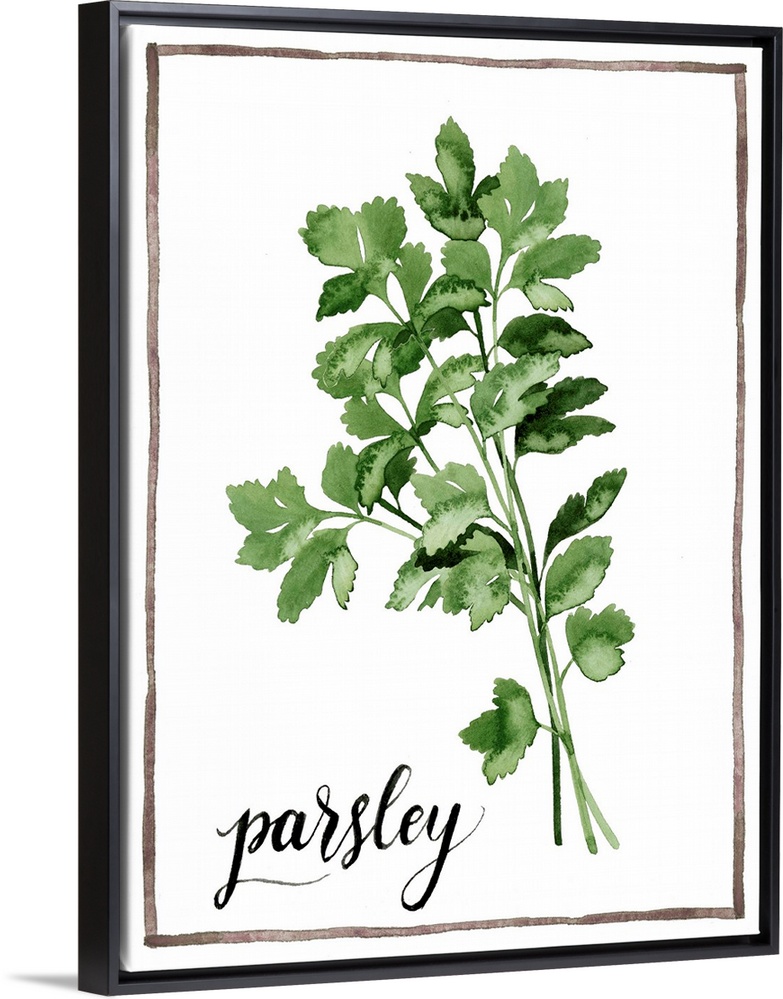 <p>Watercolor painting of parsley leaves on a white background with a brown boarder and the word "parsley" written in black script at the bottom.</p>