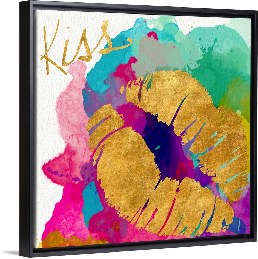 <p>A gold lip print on a multicolored watercolor background.</p>
