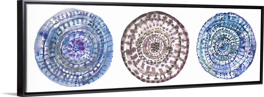 <p>Three circular watercolor shapes with swirls and patterns.</p>