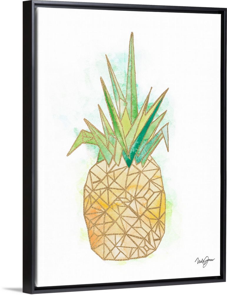 <p>Watercolor painting of a pineapple created with metallic gold geometric shapes on a white background.</p>