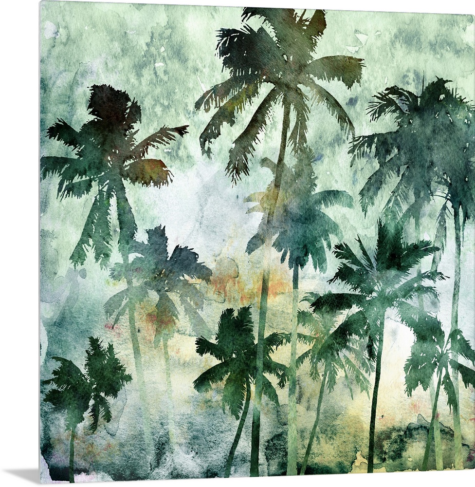 <p>A square watercolor painting of a group of palm trees in shades of green.</p>