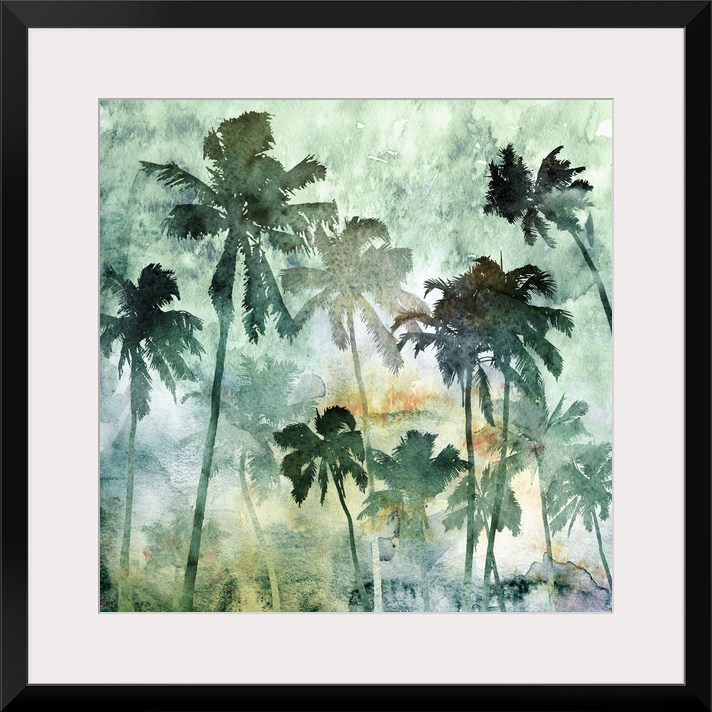 <p>A square watercolor painting of a group of palm trees in shades of green.</p>