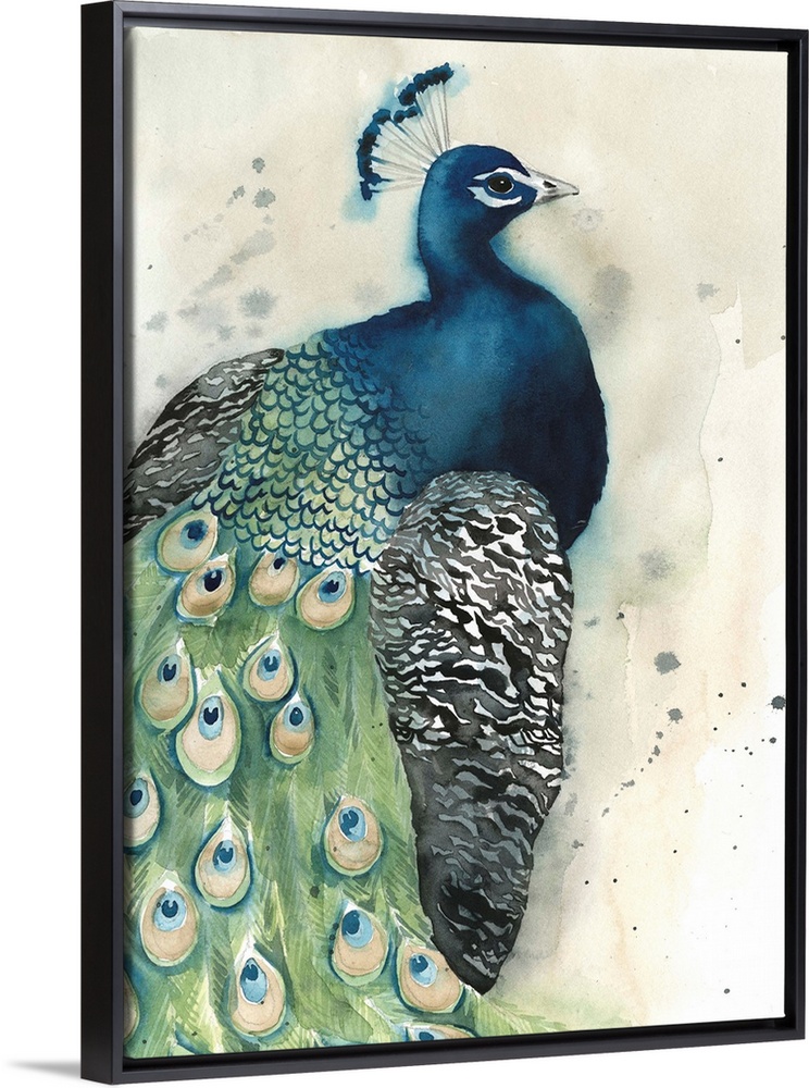 <p>Contemporary watercolor peacock against a neutral background.</p>