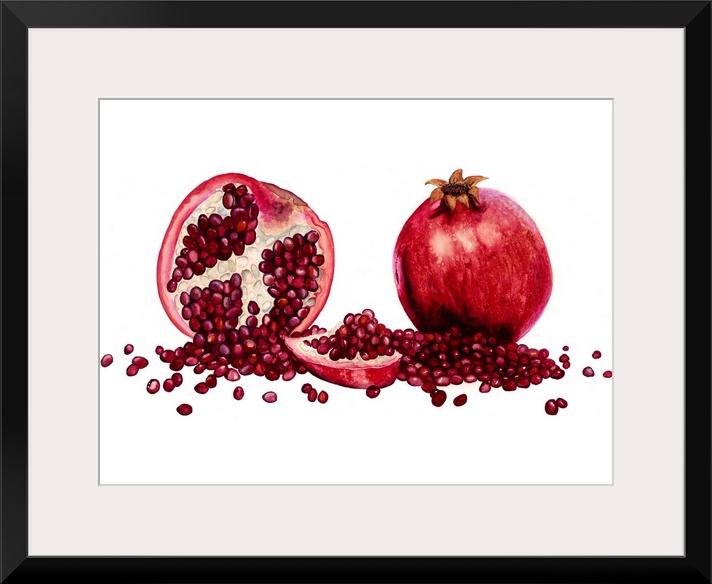 <p>Watercolor painting of a whole and halved pomegranate against a white background.</p>