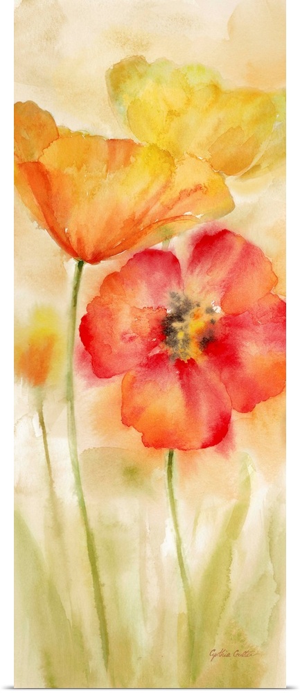 <p>A bright watercolor painting of red, orange and yellow poppies against a faded orange and green backdrop.</p>