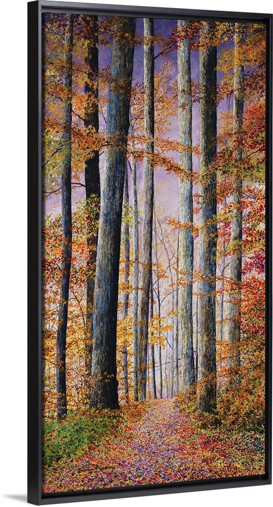 <p>A contemporary painting of a path in the woods surrounded by Fall trees and a violet sunset.</p>