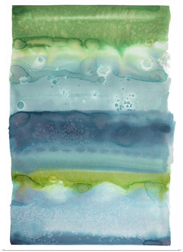 <p>Blue and green watercolor painting created in layered horizontal sections on a white background.</p>