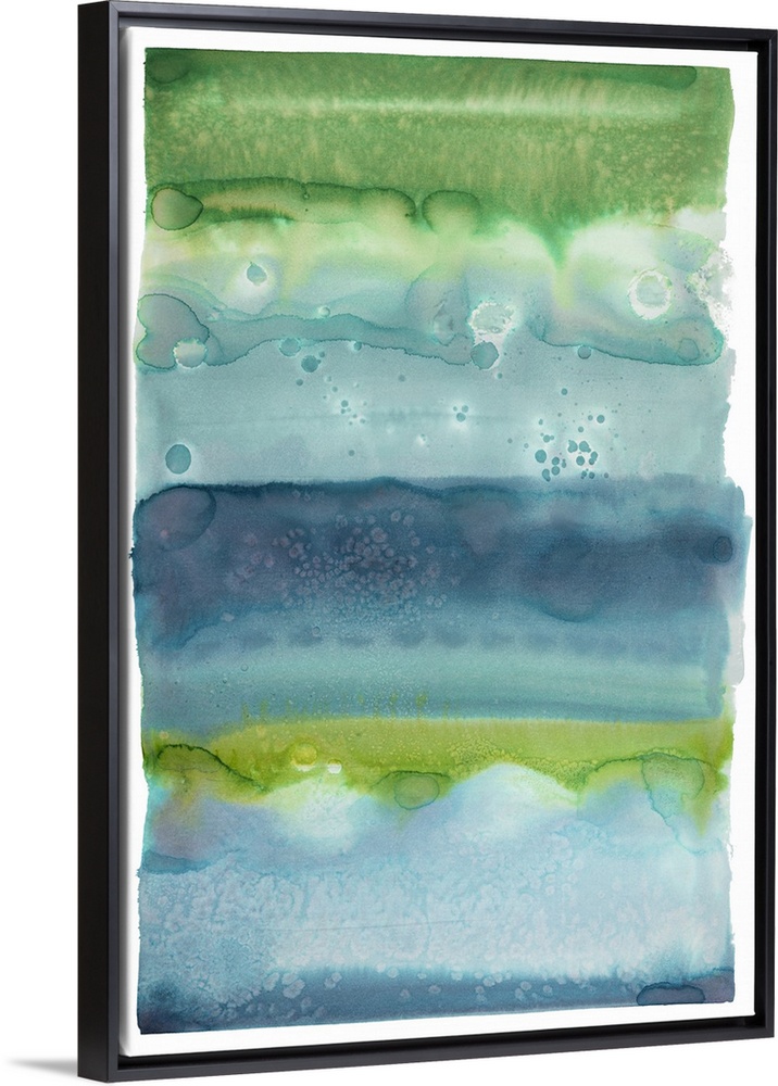 <p>Blue and green watercolor painting created in layered horizontal sections on a white background.</p>