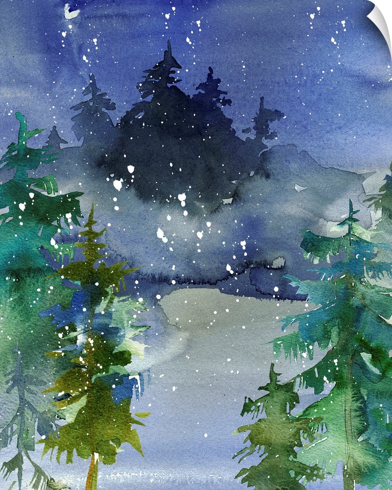 <p>Watercolor painting of an outdoor Winter scene with pine trees and snow falling.</p>
