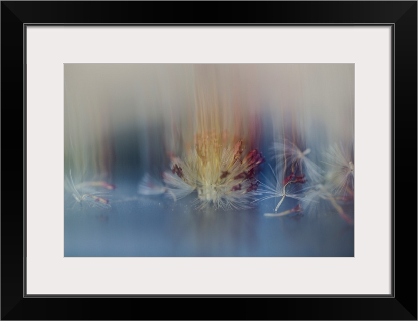 <p>Dream-like photograph of dandelion seed remnants and dried up red petals with a blurry overlay.</p>