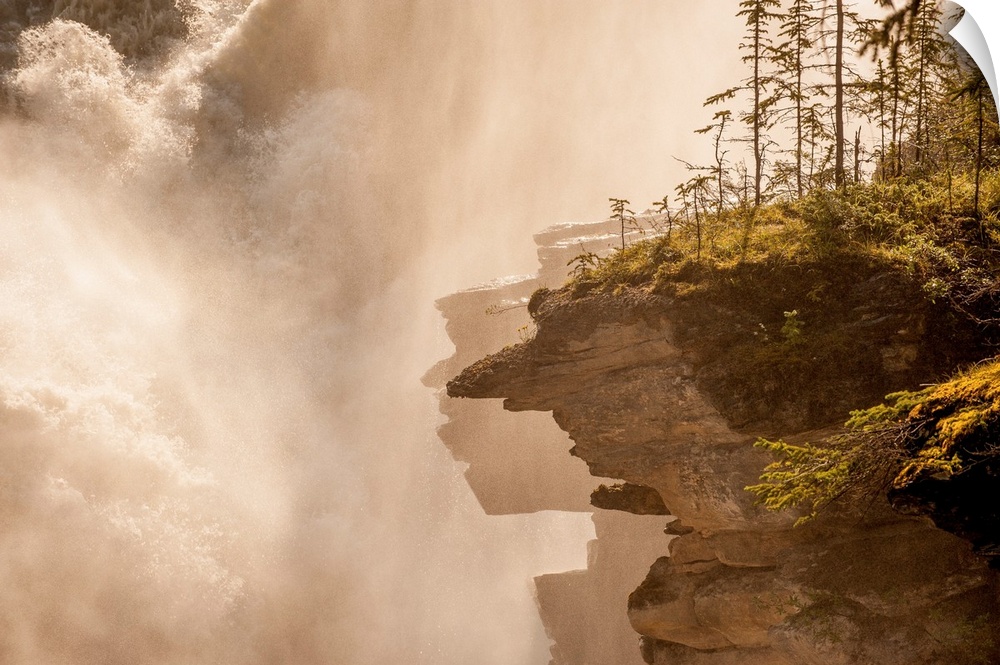 <p>Misty photograph of rocky cliffs next to a large, rushing waterfall.</p>