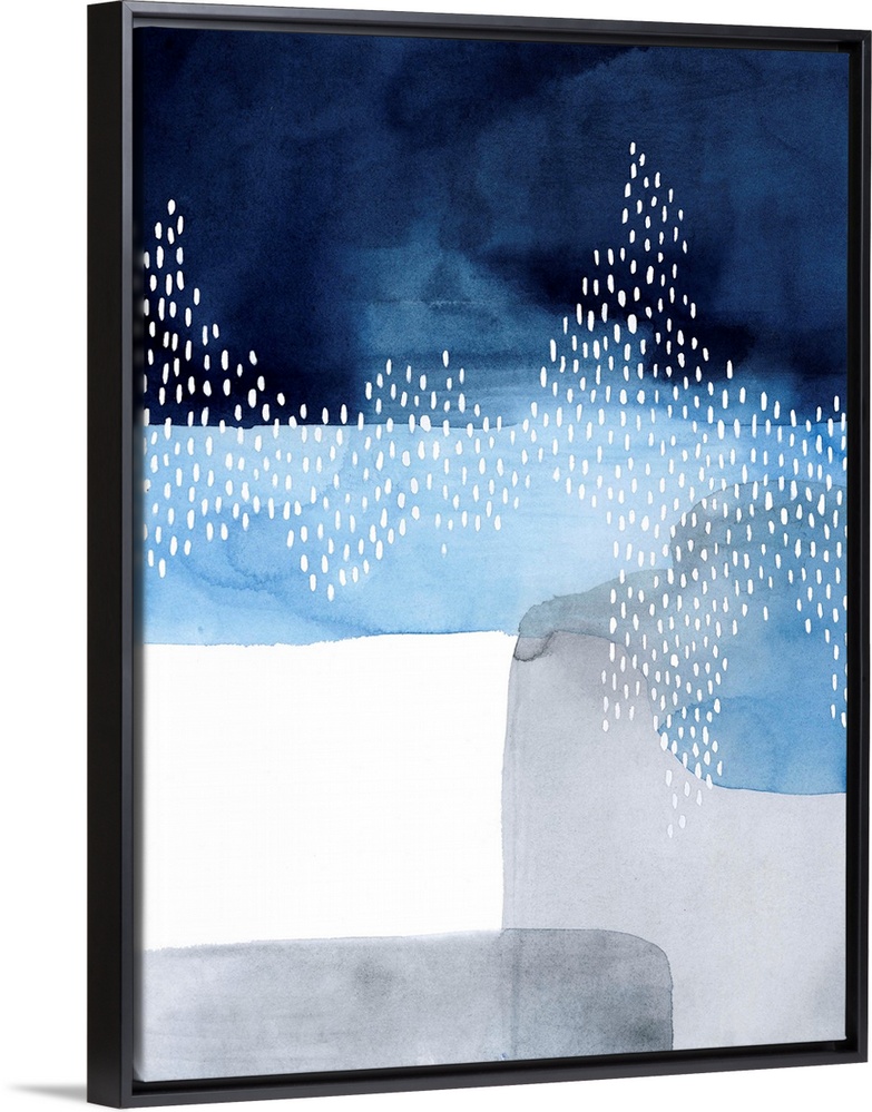 <p>Abstract watercolor painting of blocks of blue and grey color with a white dot pattern.</p>