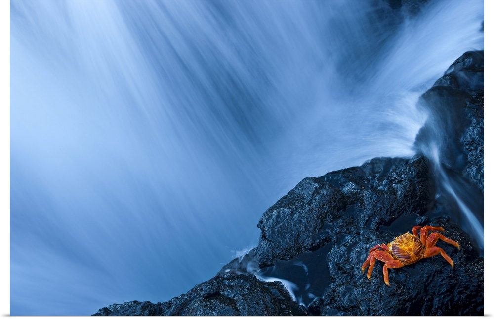 <p>Water from a waterfall rushing past a rocky cliff where a crab is resting, San Salvador Island, Galapagos, Ecuador</p>