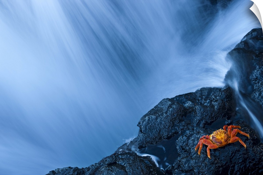 <p>Water from a waterfall rushing past a rocky cliff where a crab is resting, San Salvador Island, Galapagos, Ecuador</p>