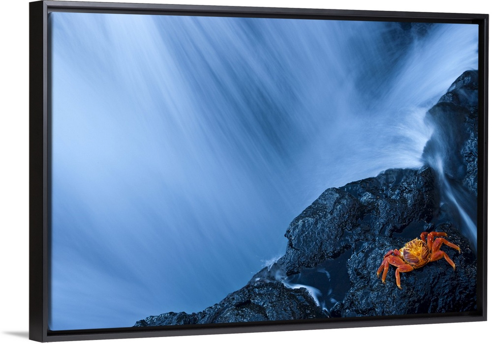 <p>Water from a waterfall rushing past a rocky cliff where a crab is resting, San Salvador Island, Galapagos, Ecuador</p>