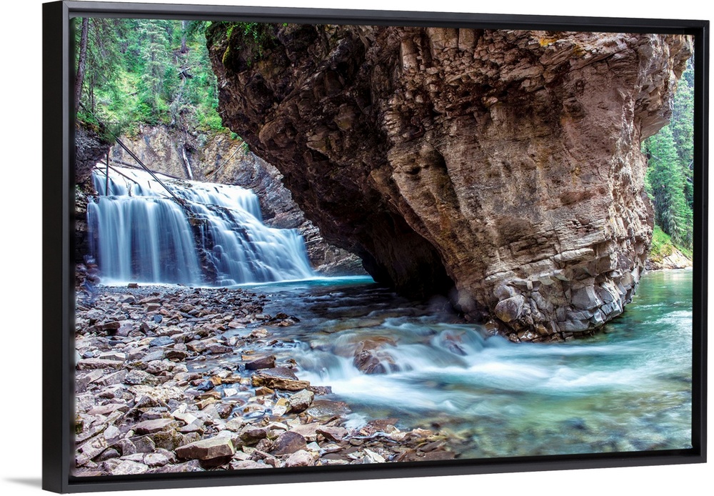 <p>Waterfall and boulder at Johnston Canyon in Banff National Park, Alberta, Canada.</p>