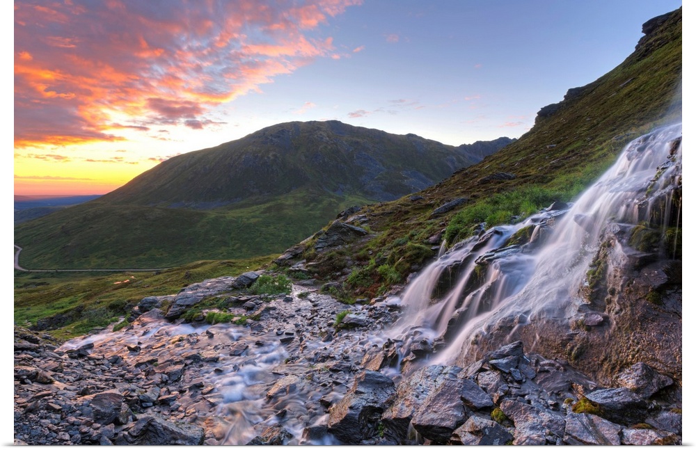 <p>Scenic sunset view of a waterfall at Summit Lake State Recreation Site, Hatcher Pass, Alaska.</p>