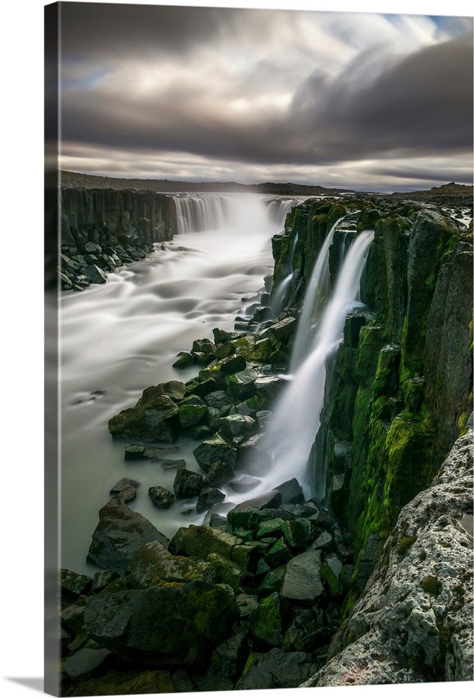 <p>Waterfall flowing over moss covered cliffs; Selfoss, Iceland</p>