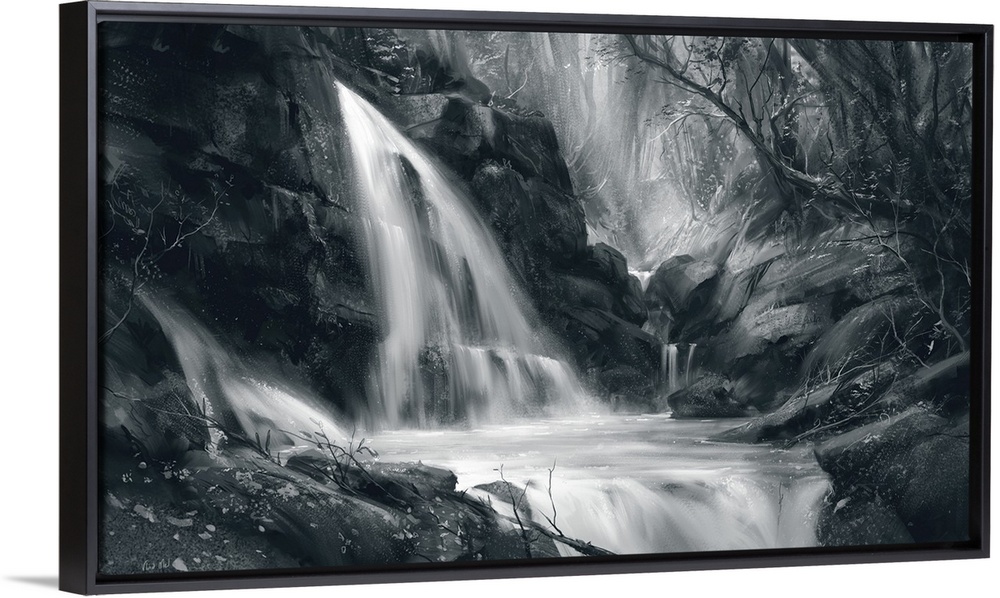 <p>Monochrome painting of waterfall scene in forest.</p>