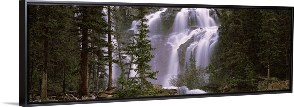 <p>Panoramic photograph shows water furiously cascading down various steep rock faces within a dense woodland in North America.</p>