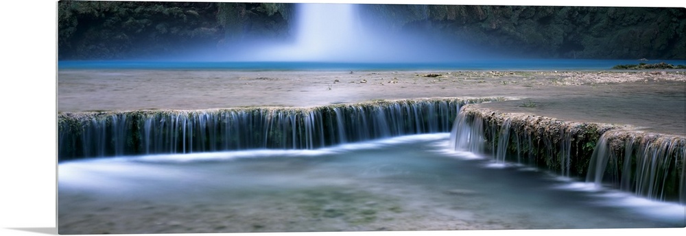 <p>This is a panoramic, time lapsed photograph of water flowing over shallow waterfalls in a desert oasis.</p>