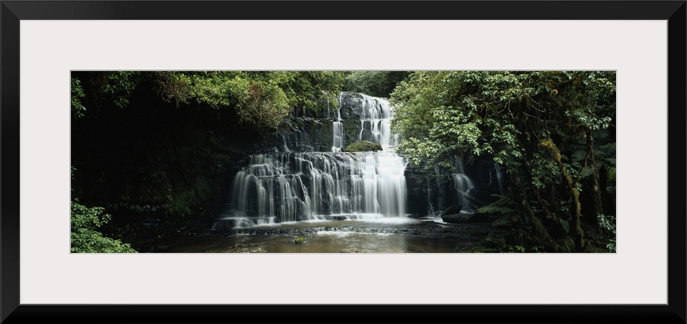 <p>Wide angle photograph of green trees and foliage surrounding Purakaunui Falls in the Catlins, on South Island, New Zealand.</p>
