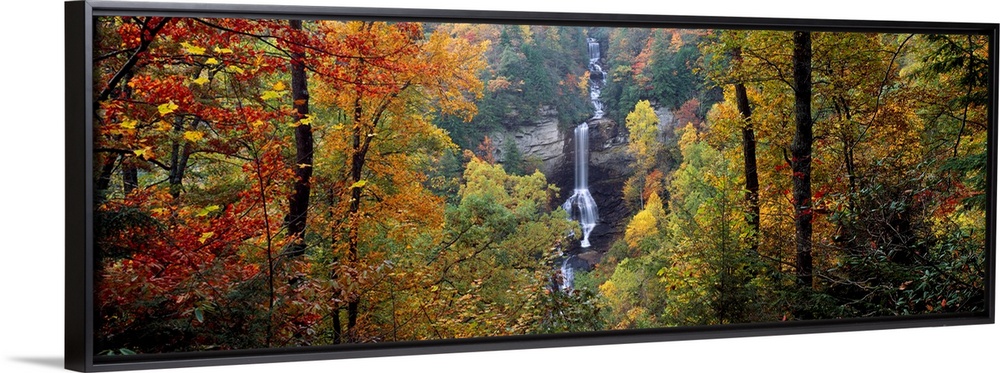 <p>This panoramic wall art is a photograph of a waterfall cascading down a sheet rock face in an autumn forest in the Appalachian Mountains.</p>
