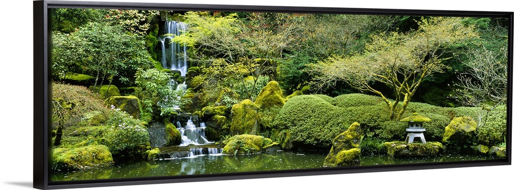 <p>Wide angle photograph taken of a small waterfall inside a Japanese garden. It's surrounded by lush green foliage.</p>