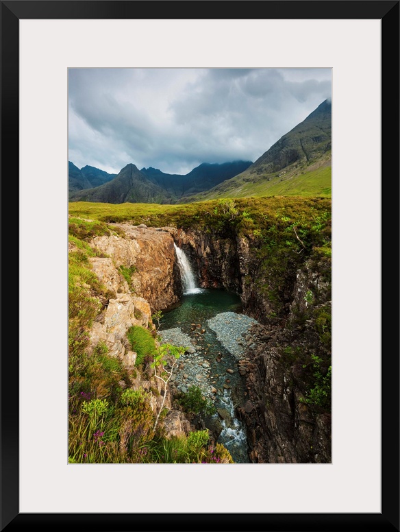 <p>Waterfall in Coire na Creiche near Glen Brittle with the hills of the Black Cuillin in the background; Isle of Skye, Scotland</p>