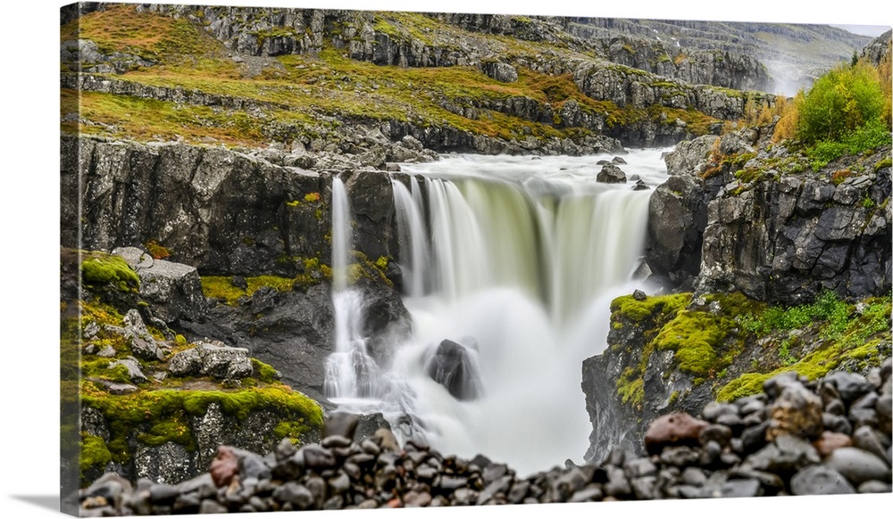 <p>A waterfall over a rocky landscape in autumn colours; Djupivogur, Eastern Region, Iceland.</p>