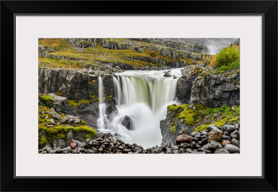 <p>A waterfall over a rocky landscape in autumn colours; Djupivogur, Eastern Region, Iceland.</p>
