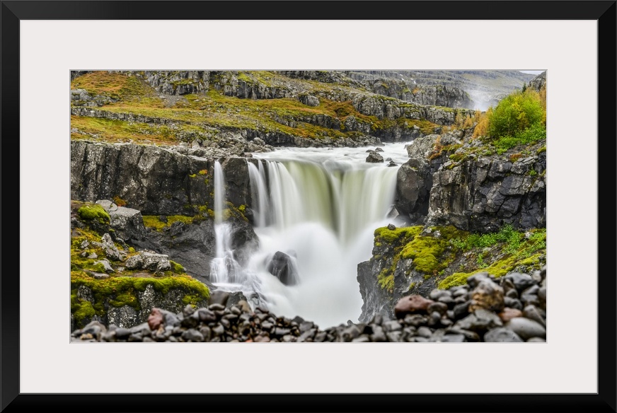 <p>A waterfall over a rocky landscape in autumn colours; Djupivogur, Eastern Region, Iceland.</p>