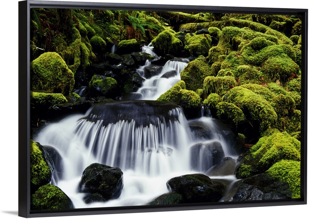<p>A waterfall dumps clean water over mossy rocks in Olympic National Park in Washington state (WA). Lush growth surrounds the water's path.</p>