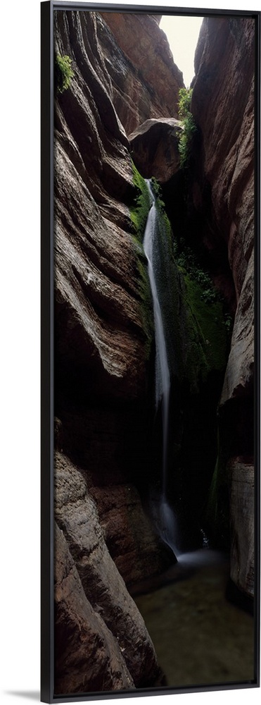 <p>Vertical panoramic photograph of cascading water falling between tall rock formations.</p>
