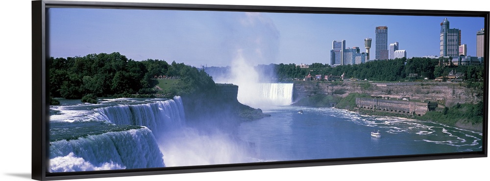 <p>Panoramic photograph of the three waterfalls that straddle the international border between Canada and the United States with city skyline in the distance under a clear sky.</p>