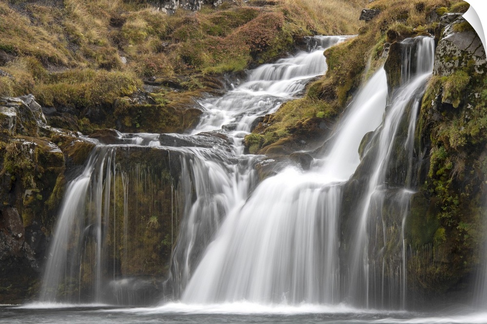 <p>Waterfalls cascading over the cliffs in the rugged countryside Iceland</p>