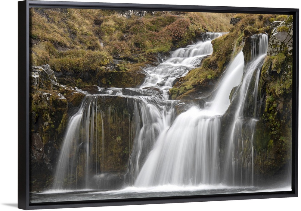 <p>Waterfalls cascading over the cliffs in the rugged countryside Iceland</p>