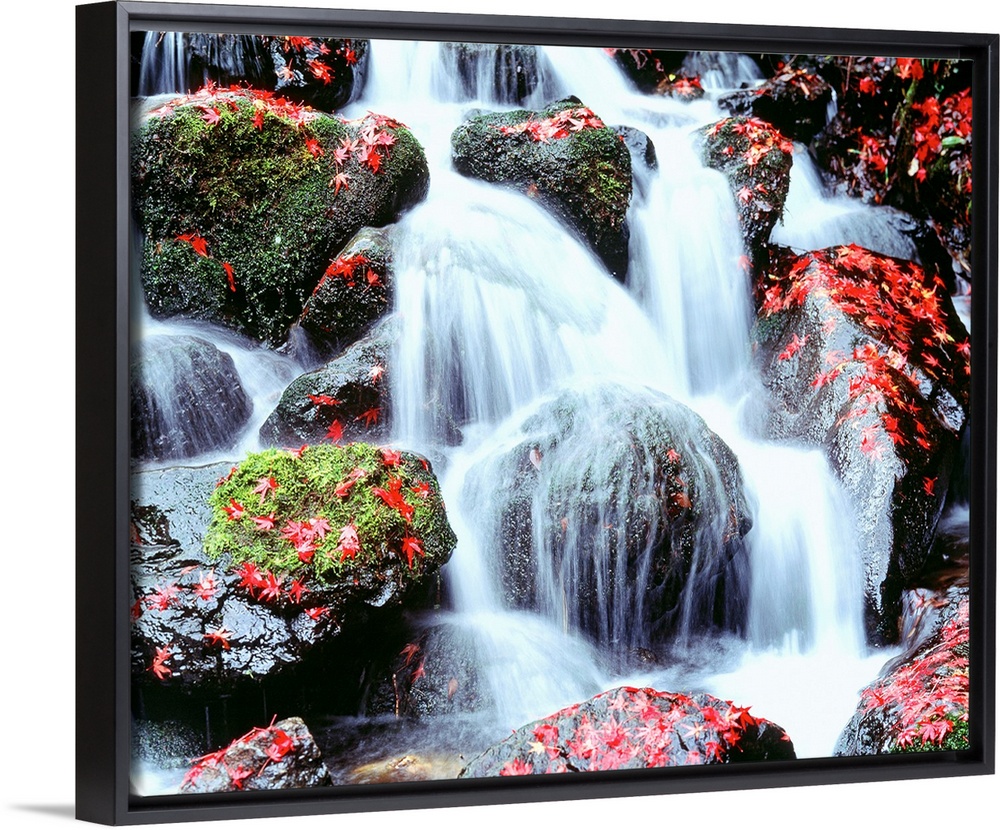 <p>Large photograph includes water cascading furiously over moss and leaf-covered rocks.</p>