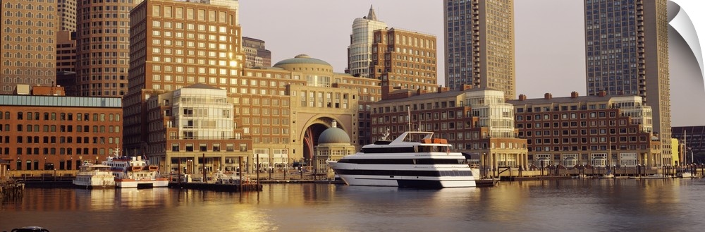 <p>Landscape photograph on a large canvas of boats in the water along the shore of Boston, Massachusetts, with large buildings towering over the water.</p>
