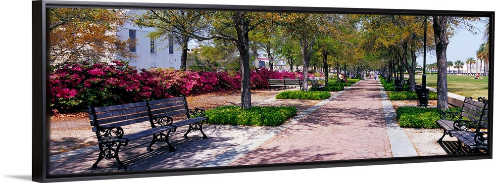 <p>Panoramic of a long tree lined brick walkway in historic waterfront Charleston, South Carolina.</p>